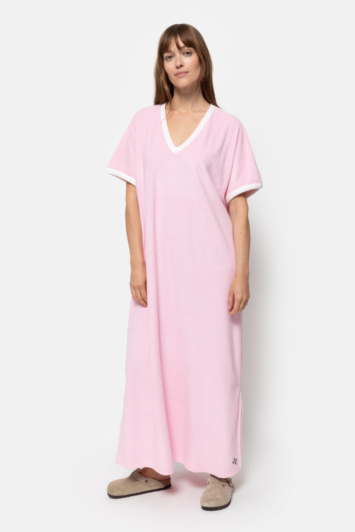 Folie est notre robe caftan à la cheville, avec un décolleté en V et des manches courtes. C'est probablement l'une de nos robes les plus décontractées et très facile à enfiler. Associez-la à un sac en toile et des chaussons, et vous êtes prête.